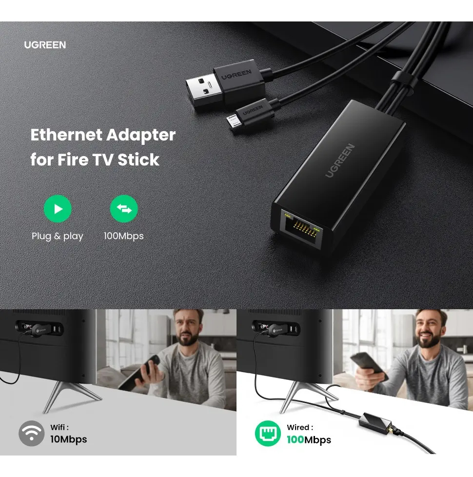UGREEN – Adaptador Ethernet Fire Stick, Ethernet con cable de 1 metro y cable de alimentación, estable y rápido, Plug and Play, compatible con Fire TV Stick/4k/4k Max/Lite, Google Chromecast, Roku Express 4k y mas….