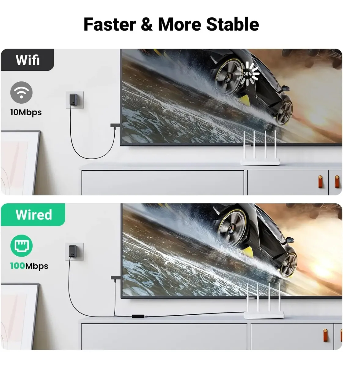 El adaptador Ethernet UGREEN Chromecast puede proporcionar una velocidad de Internet de 10/100 mbps. La conexión por cable estable y la alta velocidad de Internet te ayudan a ver videos 4K HD sin problemas.