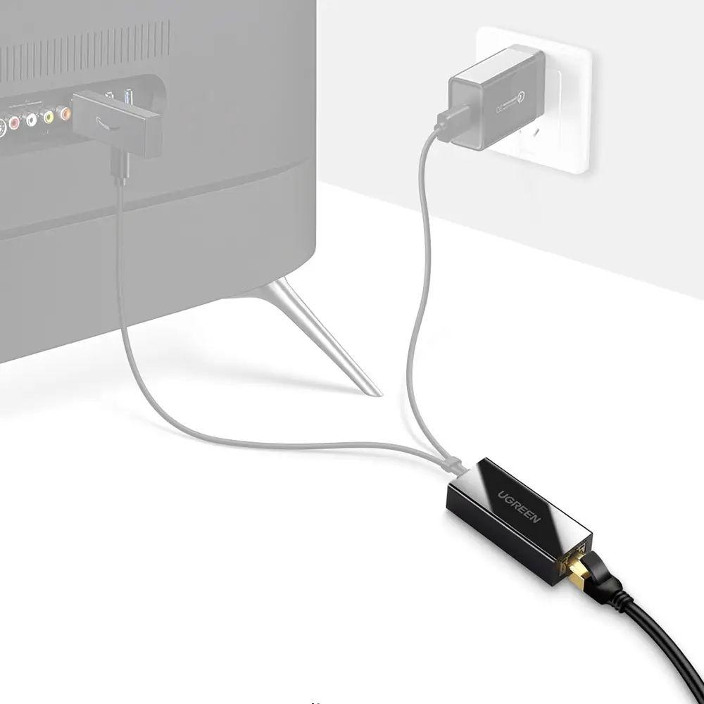 El adaptador USB a Ethernet UGREEN no necesita instalar ningún software, simplemente conecta el cable micro USB a la TV Stick, el cable Ethernet al puerto RJ45 del adaptador y el cable USB a la fuente de alimentación. Operación simple y uso conveniente.