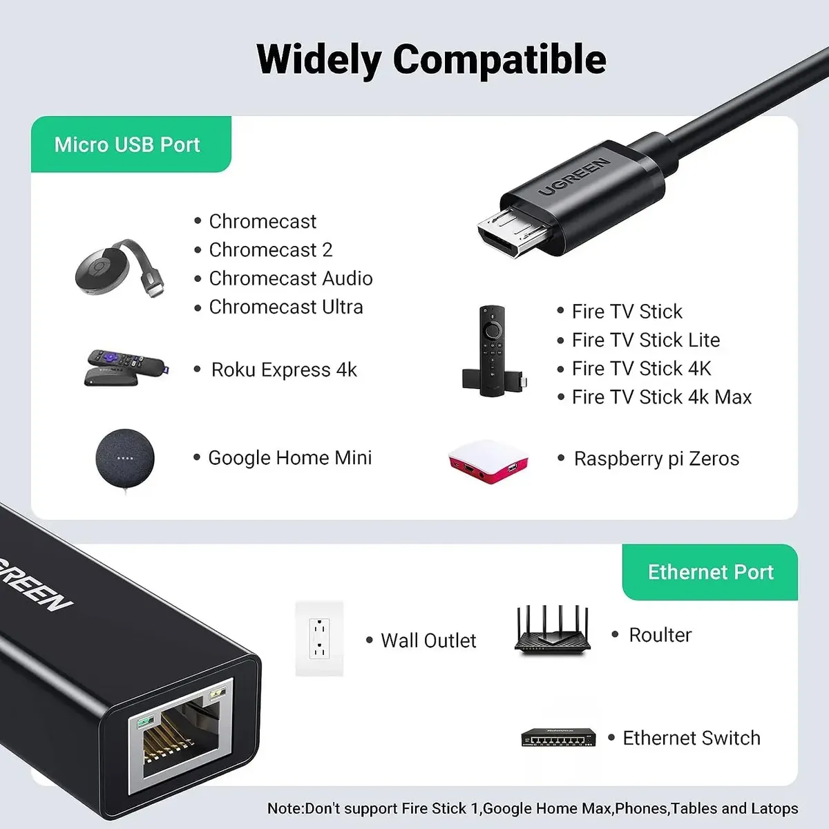Adaptador Ethernet UGREEN Fire Stick compatible con Fire Stick Basic/4k MAX/4k/Lite, Google Chromecast 1/2/3/Ultra/Audio, Google Home Mini, Roku Express 4K y más. (Nota: no es compatible con Fire Stick 1, teléfonos celulares Google Home Mini, tabletas y computadoras portátiles.)