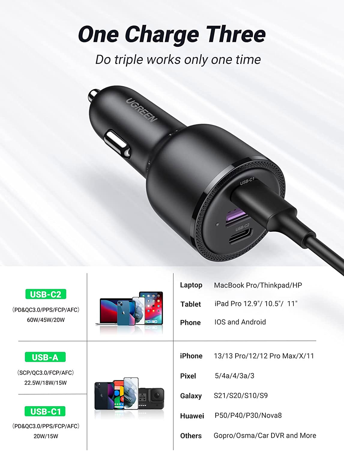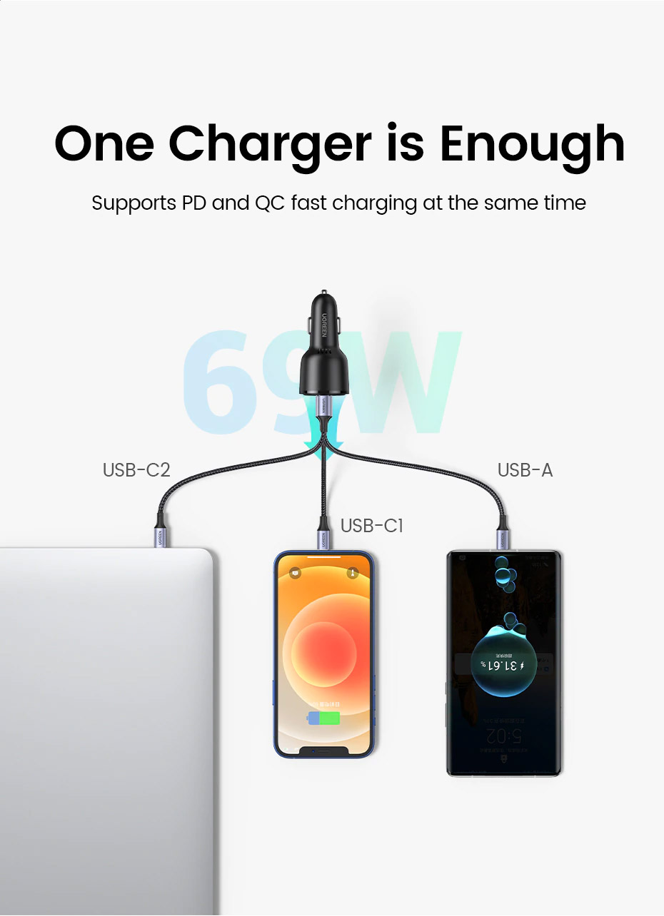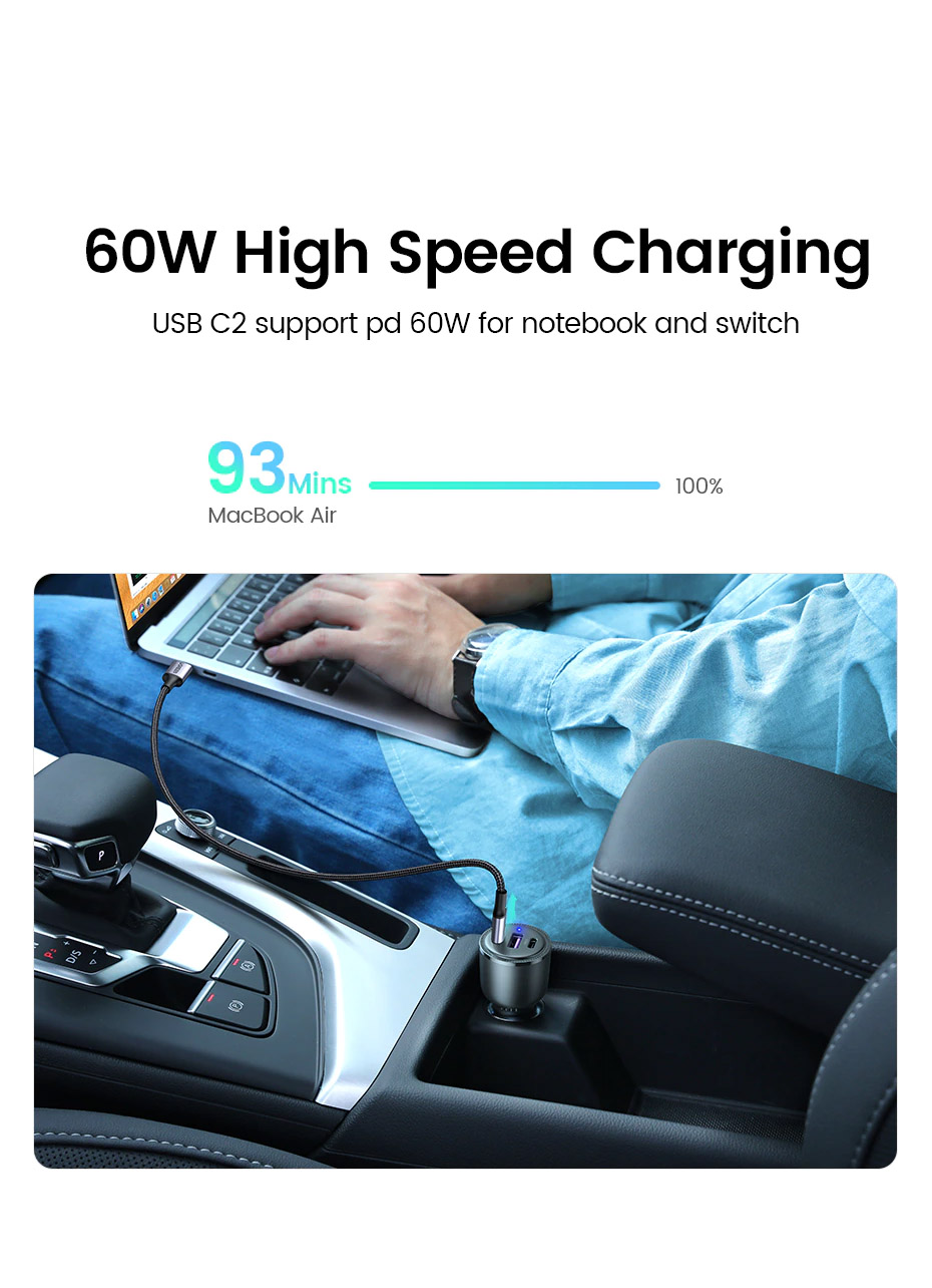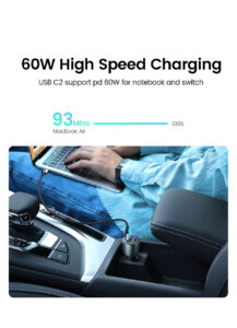 UGREEN 69 W cargador rápido para automóvil carga rápido para su MacBook y otras ordenadores portátiles, nunca se preocupe por la falta de energía. El cargador de coche admite una potencia máxima de 60 W a través del puerto USB-C2. Permite cargar su MacBook Air de 0 a 100% en solo 93 minutos.