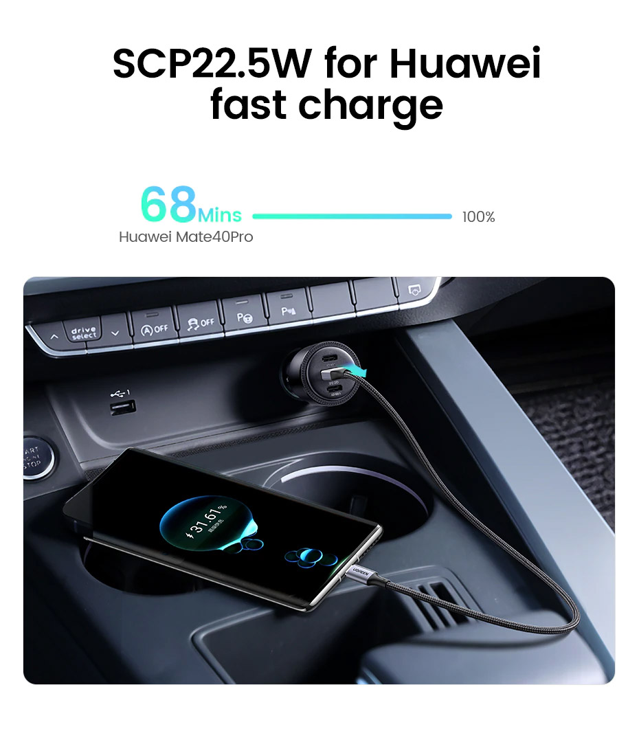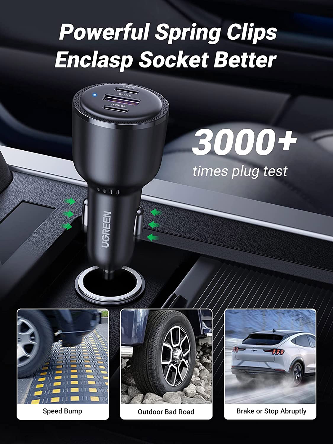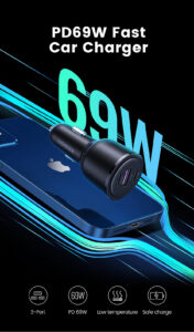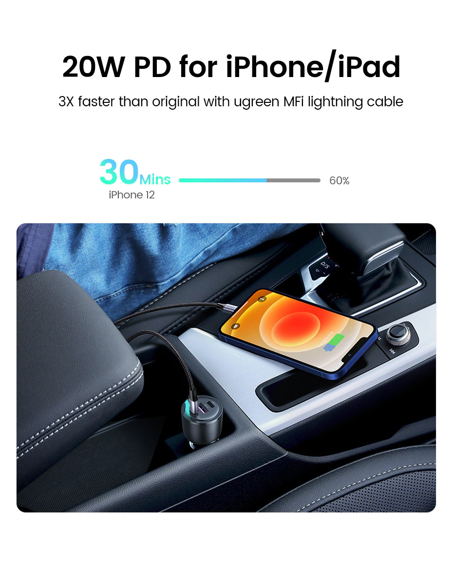 UGREEN 69 W cargador rápido para automóvil carga rápido para su MacBook y otras ordenadores portátiles, nunca se preocupe por la falta de energía. El cargador de coche admite una potencia máxima de 60 W a través del puerto USB-C2. Permite cargar su MacBook Air de 0 a 100% en solo 93 minutos.