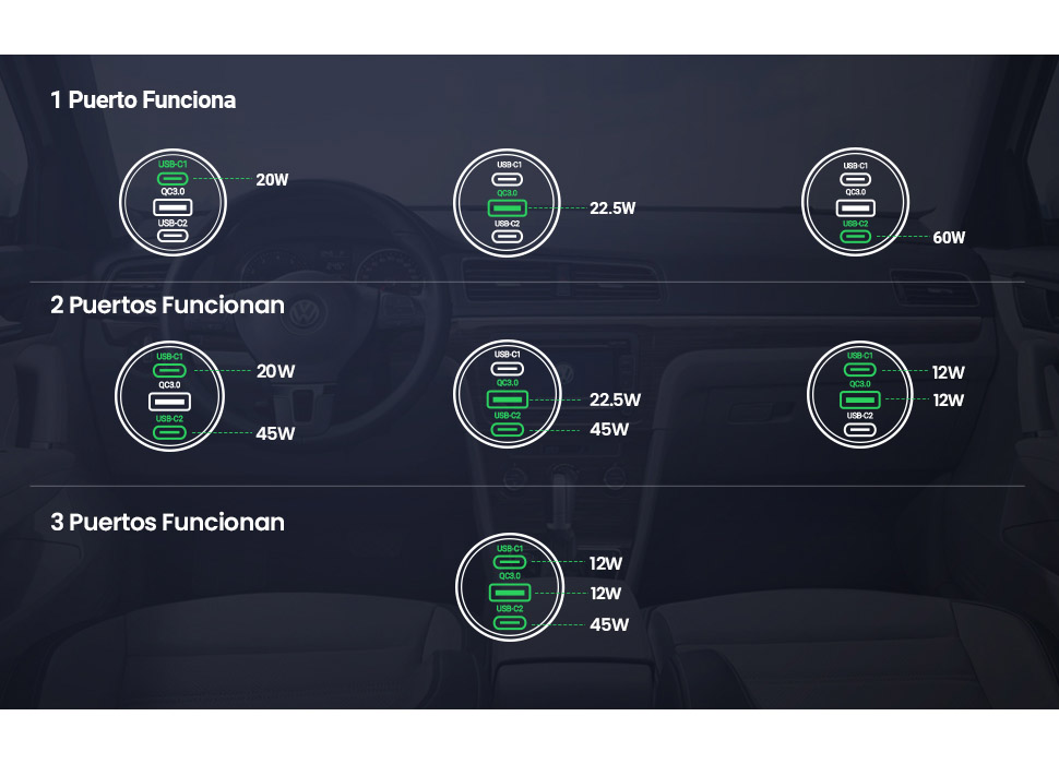 Los puertos USB-C 1, USB-C 2 y QC 3.0 admiten respectivamente la potencia de 20 W, 60 W y 22,5 W cuando se usan solos, los dos puertos USB-C ofrecen una carga simultánea de alta velocidad a su ordenador portátil (C2-45W) y móvil (C1-20W), y los puertos de tres salidas brindan carga simultánea de 45W + 12W + 12W a 3 dispositivos. Compañero perfecto para viajes familiares.