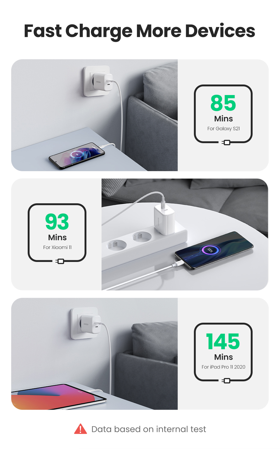 Carga cualquier dispositivo electrónico con un potente cargador que soporta protocolos de carga rápida como: PD 3.0, QC 4.0, PP y BC1.2. Funciona perfectamente para teléfonos que necesitan 20 W de potencia o menos.