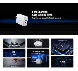Equipado con 2 puertos USB C que soportan 40 W máximo en total, este bloque de carga rápida PD puede cargar fácilmente tu teléfono celular y tableta simultáneamente.
