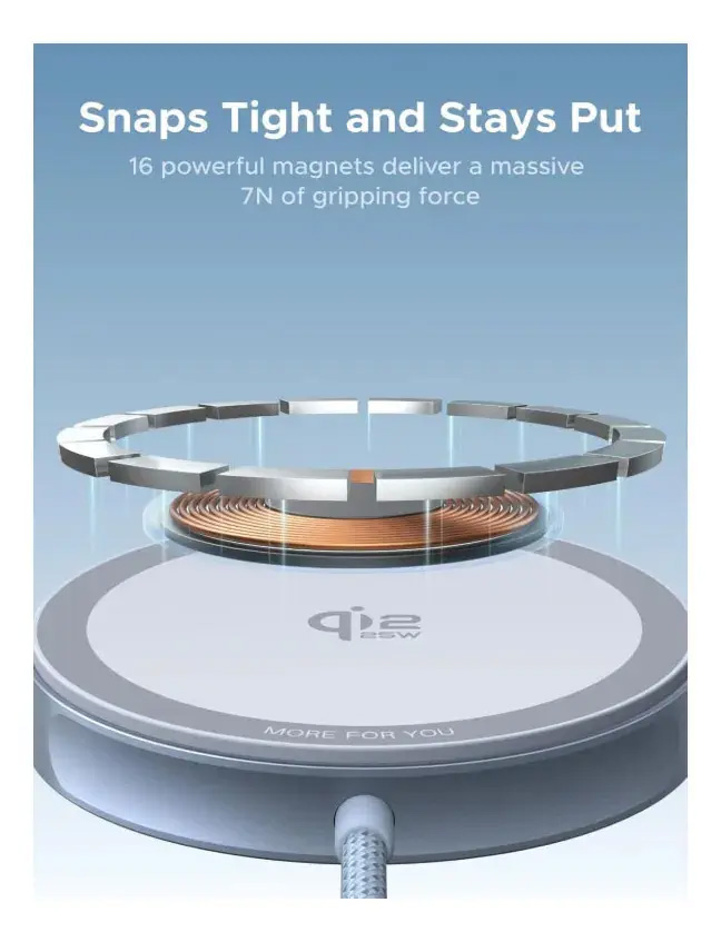 Los potentes imanes incorporados alinean su teléfono automáticamente para una carga estable y confiable sin resbalones.