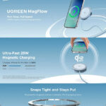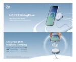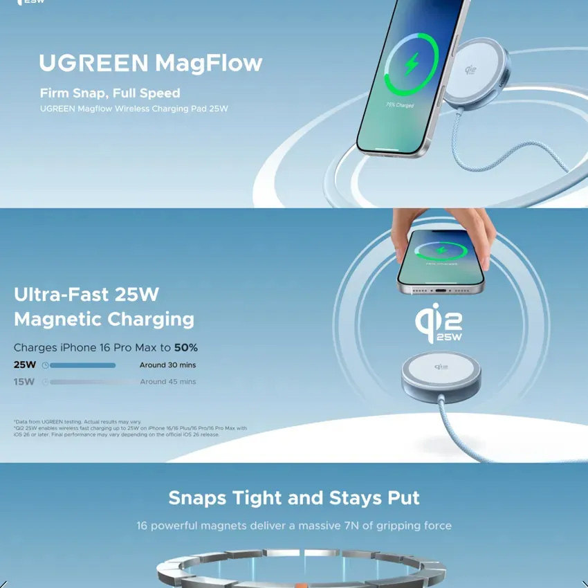 Base de carga inalámbrica magnética UGREEN MagFlow de 25W MagSafe Para iPhone 17, 16, y mas AirPods Celeste. (COD. 55959)