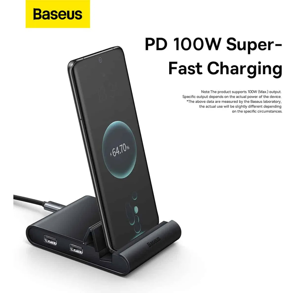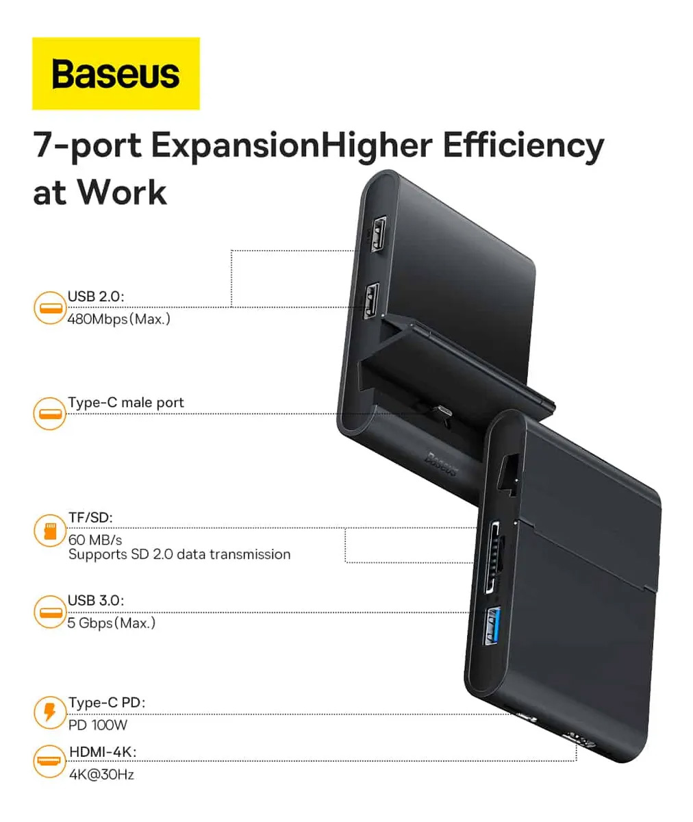 Baseus – Docking USB Tipo-C HUB 7 en 1, hasta 100w, 3 Puertos USB, 1 Puerto HDMI, 1 Puerto de Carga Tipo C, Ranura de Memoria SD y MicroSD. Incluye Cable Tipo C a C de 1 Metro.