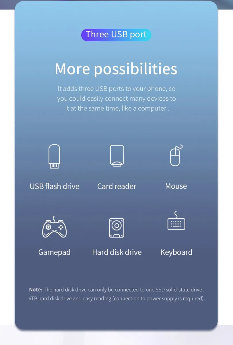 – Tres puertos usb, conéctese fácilmente muchos dispositivos al mismo tiempo conexión con teclado y mouse, el teléfono se puede usar como computadora y puede editar documentos más rápido, conexión de gamepad, operaciones de gamepad más ágiles.