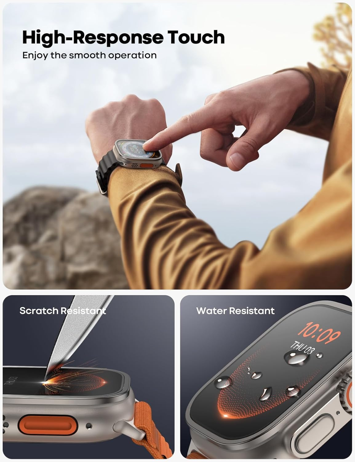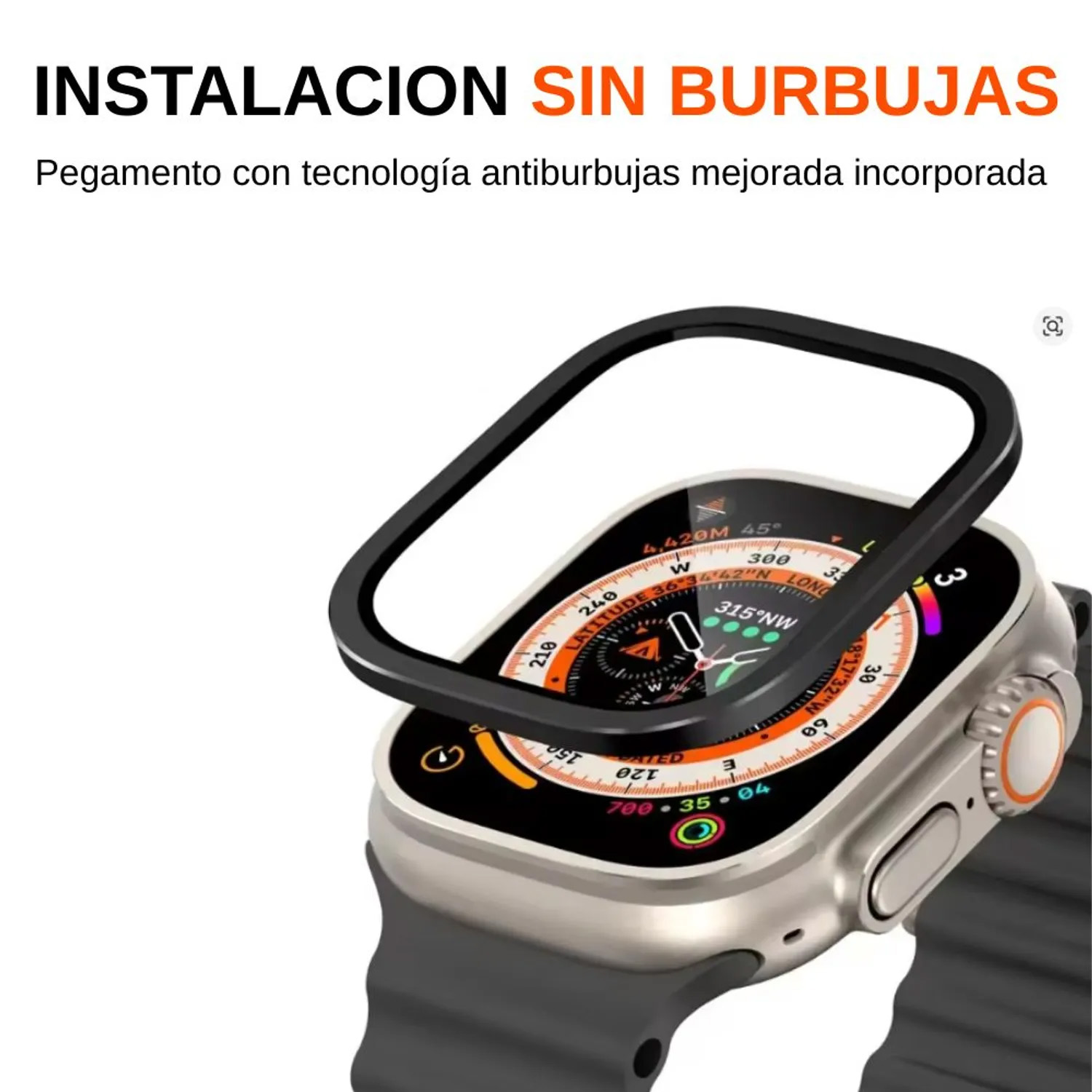Hecho de material de vidrio templado y aluminio, este protector es evita los arañazos, polvo, golpes y protección total para tu Apple Watch Ultra de 49mm. Es resistente al agua y el agua no se filtra en la pantalla entre el protector de pantalla.